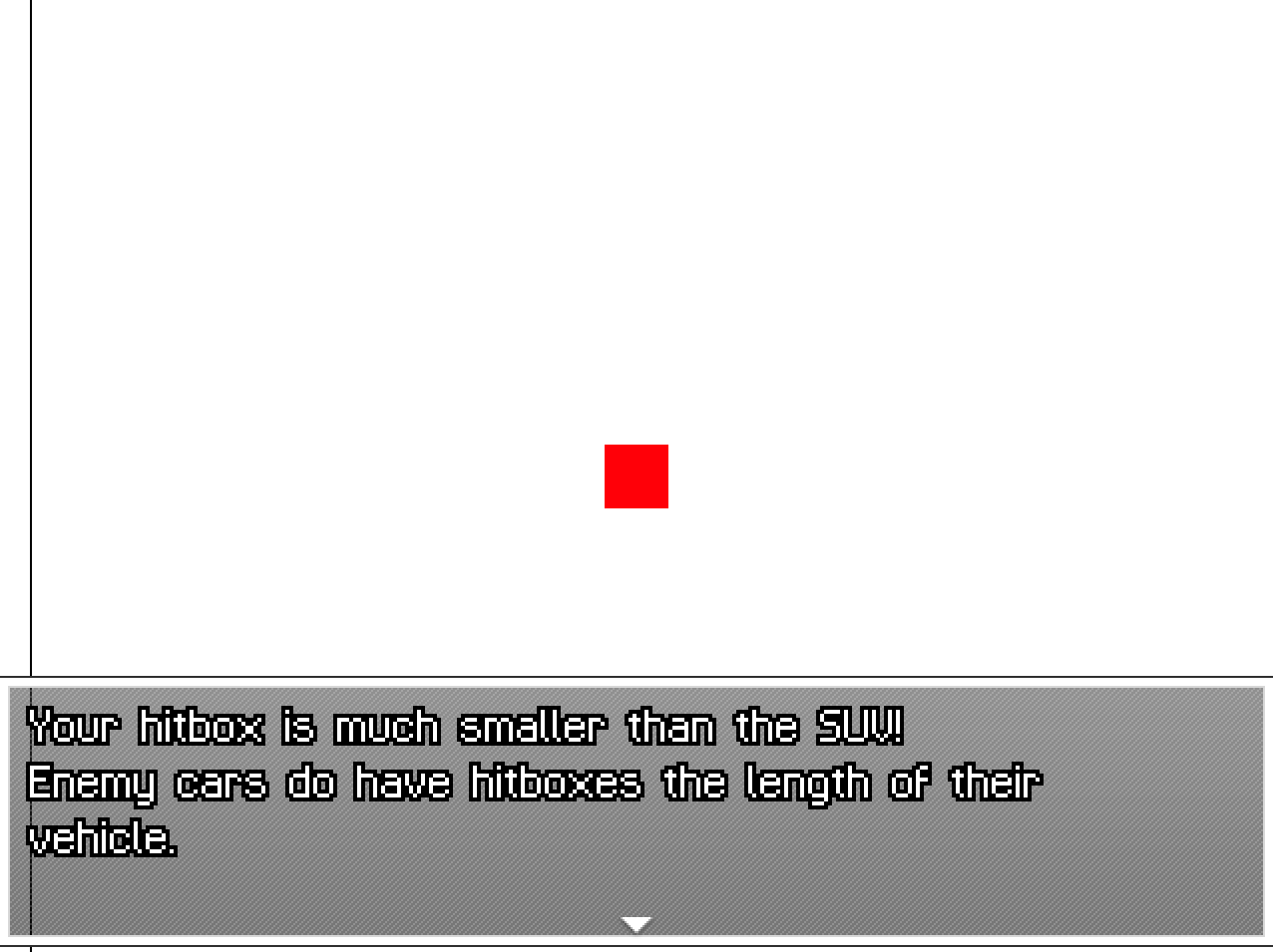 I've been trying to make the previous content in the game a bit more fun based on prior feedback. The car dodging minigame is a little shorter, it has a new feature where you can charge into obstacles with temporary invincibility, and I've updated it a bit for visual clarity. Hopefully this makes it more engaging! Also, there's a tutorial now just in case. Currently this will only play once but I'd like to give the option to view it elsewhere later